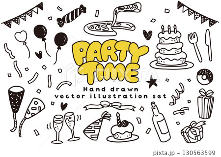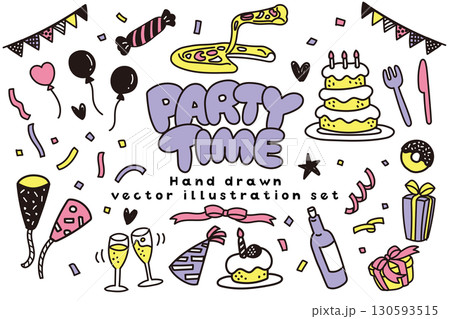 結婚式や誕生日を祝うパーティの手書きイラストセット。蝋燭が立てられた記念日のケーキ。花束、紙吹雪、ギ