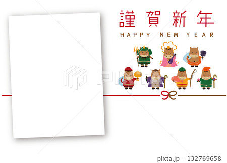 年賀状素材イラスト 午年 七福神 縦 Happy new year