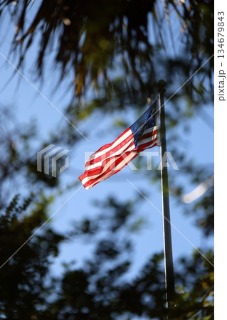 アメリカ合衆国の国旗である星条旗が晴天の空に勢いよくはためく