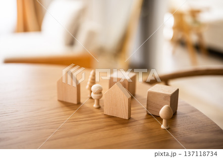 机に並ぶ木の玩具