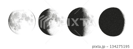 Phases moon, monochrome dotted halftone progression science. Minimal moon phases design circle dots