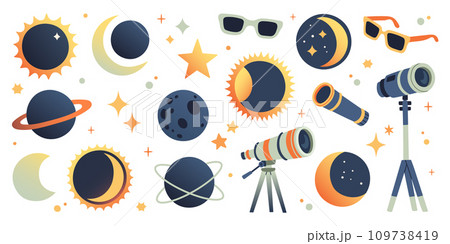 Solar eclipse set, astronomy concept. Illustration of solar eclipse stages, moon, sun, telescope isolated on white background. Vector design element for project, banner, invitation.