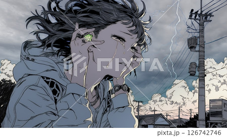 雷のエネルギーで汗をかくキャラクターのイラスト