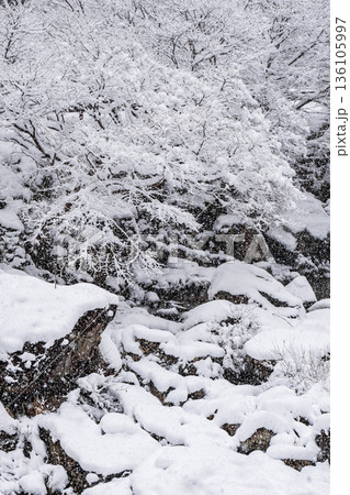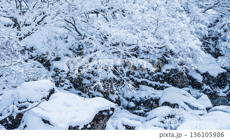 京都貴船神社奥宮 雪の中の鳥居と思ひ川