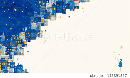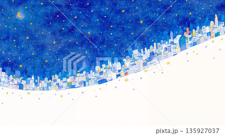 満天の星空と夜景の手書きイラスト