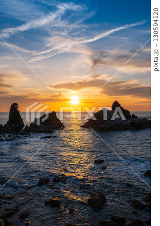 佐渡島相川地区大浦の岩礁に日本海に沈む太陽