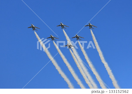 ブルーインパルスの展示飛行 快晴にスモークを曳くブルーインパルス