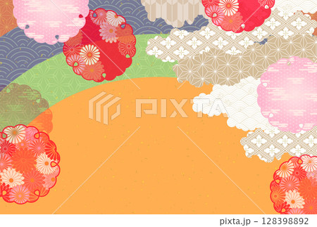 ビビットなカラーでまとめた和柄と組み合わせた山のイラスト