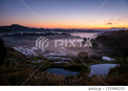 雲海に包まれる星峠の棚田と幻想的な朝焼け
