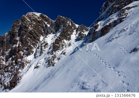 冬の八ヶ岳連峰・横岳稜線のトラバース道から見る主稜線