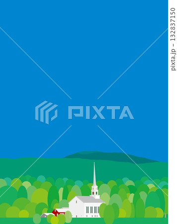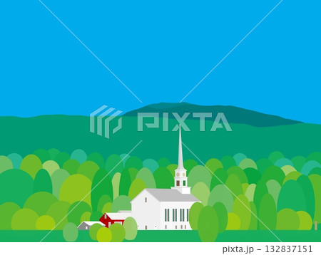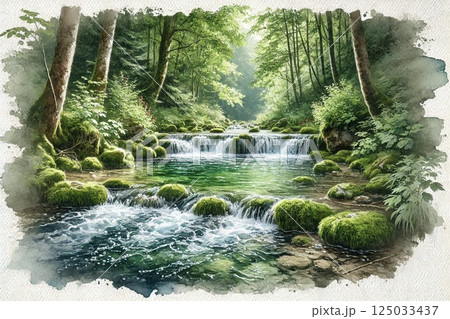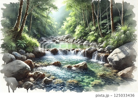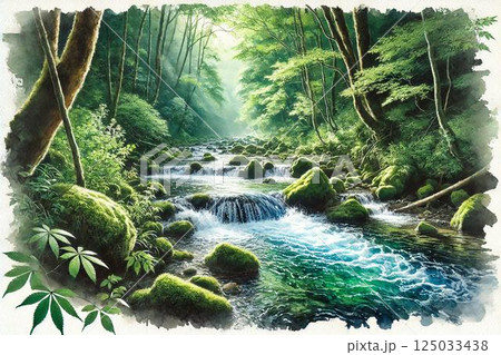 初夏の川辺と新緑の木々(水彩風景イラスト)