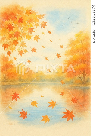 紅葉の落ち葉と水面に浮く2匹の鴨