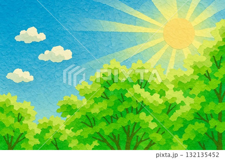 水彩風の草原と青空の風景イラスト 小さな家のある背景素材