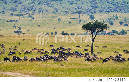 マサイマラの草原を埋め尽くすヌーの群れと立ち木