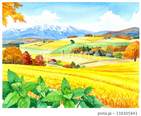 秋の草原と青空の水彩風背景イラスト