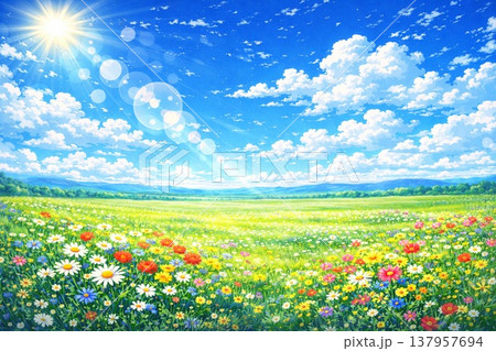 草原 花 青空 雲 太陽光線 広い大地 アニメ風