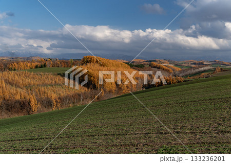 雲と紅葉が彩る美瑛のなだらかな丘