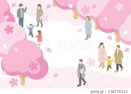 お花見を楽しむ人々のアイソメトリックイラスト。満開の桜、家族、カップル、子供たちの春の風景