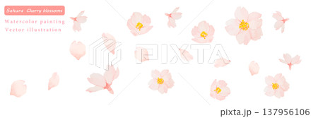 桜並木の背景バナー。水彩の柔らかな桜の花と地面に広がる桜の絨毯のイラスト素材