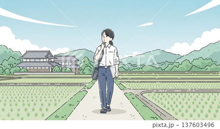 田園風景を歩く女子高生