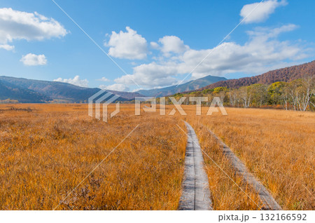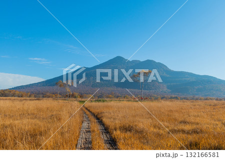 朝日に照らされる芳ヶ平湿原・日本国道標高最高地点から