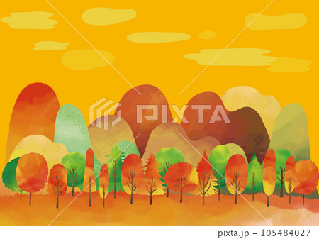 水彩タッチ 秋の山並みと木々 背景フレーム