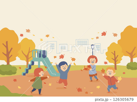Children Playing in Autumn Leaves Pile with Orange and Yellow Colours Cheerful Landscape Scene