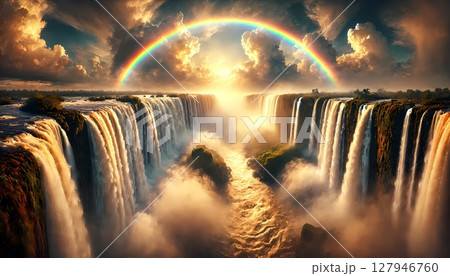 巨大な滝にかかる美しい虹 希望を表す絶景