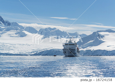 People in small inflatible zodiac rib boats passing icebergs and ice floes on the calm water around small islands of the Antarctic..