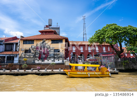 マレーシア 世界遺産マラッカ 街並みとマラッカ川をゆく黄色いウォータータクシ