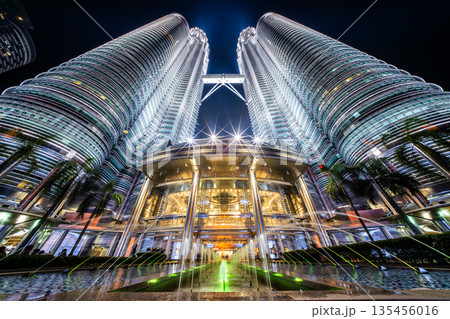 ライトアップされた夜のペトロナスツインタワー, クアラルンプール, マレーシア
