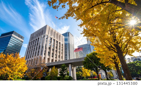 Cityscape with tall buildings and a cloudy sky. The city is bustling with activity and the buildings are tall and imposing