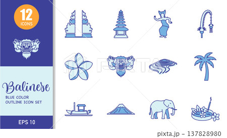 Balinese Blue Color Outline Icon Set. Vector Illustration