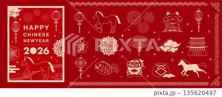 中国人の2026年新年・旧正月・春節・ルナニューイヤーのシンボルアイコンピクトグラムシルエット