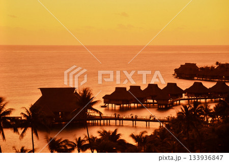 タヒチ ボラボラ島の水上コテージの夕景