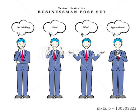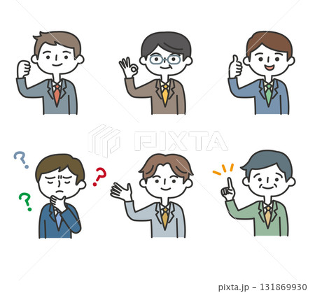 ビジネスマンの全身ポーズセット(悩む・考える・いいね・なぜ・困る・閃く)|ビジネスイラスト