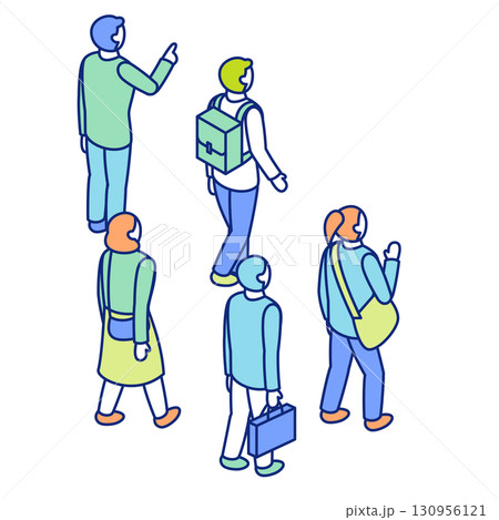 アイソメトリックの人物イラストセット。一歩方向に向かって歩く後ろ姿の集団。