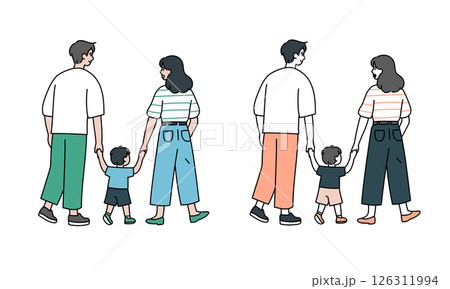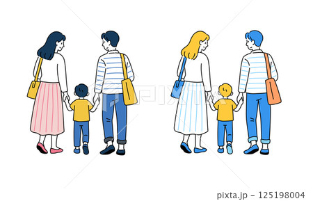 若い家族の後ろ姿 四人 カラフルでお洒落な線画イラスト