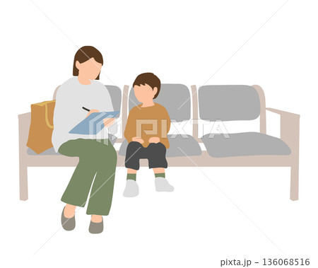 待合室で書類を記入する親子のイラスト