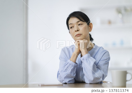 リビングで考え事をするシニア女性