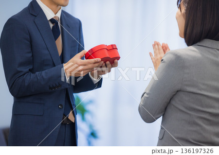 社内で男性にプレゼントを渡す女性