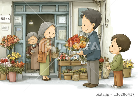花束を祖母にプレゼントする子どものイラスト(敬老の日)
