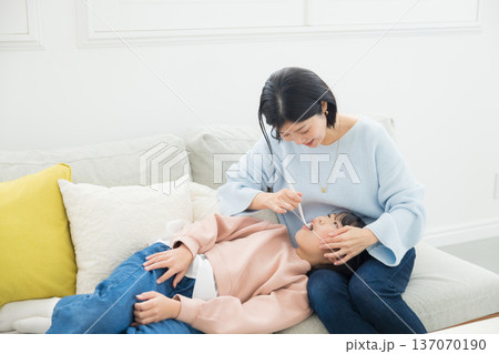 小学生に仕上げ磨きをするママ