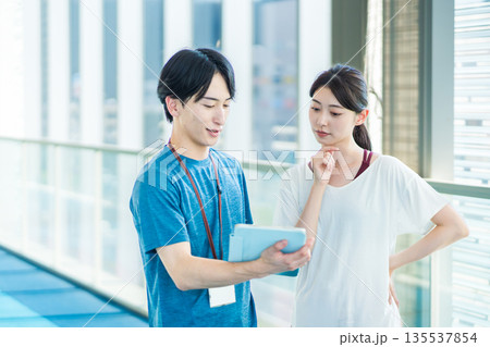 男性トレーナーと女性トレーニーの2人 撮影協力:「スポーツクラブ&サウナスパ ルネサンス 幕張24」
