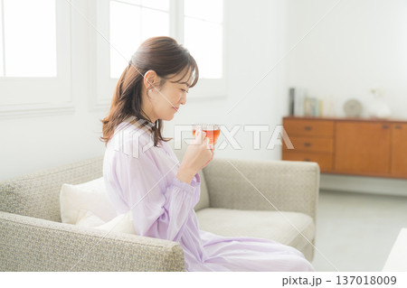リビングで紅茶を飲む女性