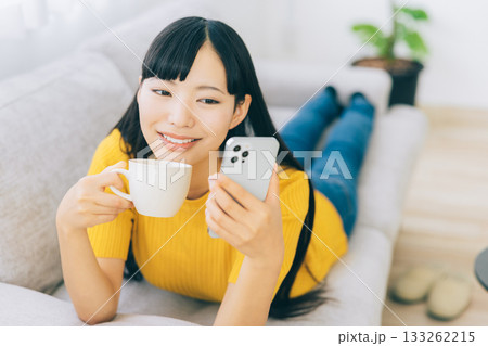 ソファに寝転がってスマホを使う女性