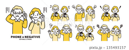 スマートフォンを持つ、ネガティブなおじいさん・おばあさん・老夫婦のベクターイラスト素材セット