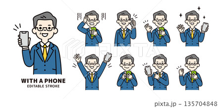 スマホを持つ中高年のビジネスマンの、いろいろな表情・ポーズのベクターイラスト素材セット