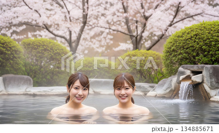 露天風呂でリラックスする若い女性の温泉旅