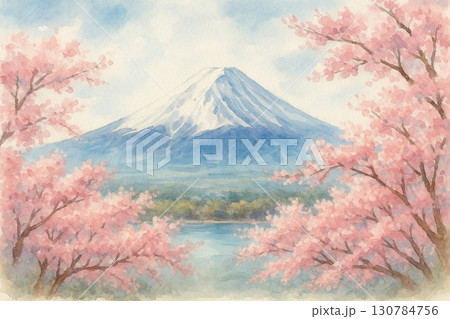 富士山と桜と湖。日本の春の自然風景。水彩画イラスト